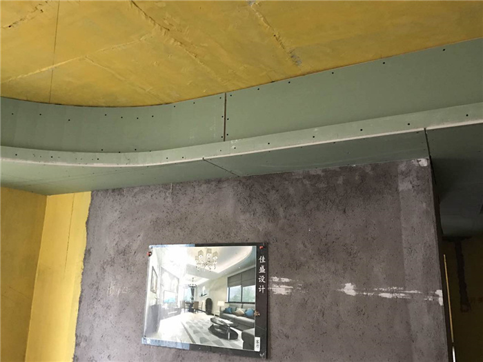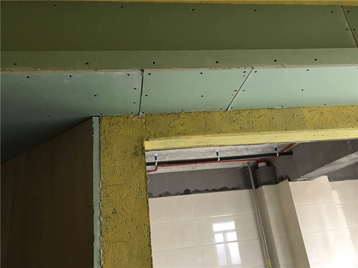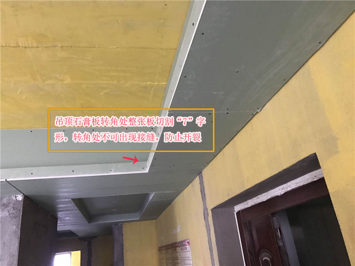 吊頂石膏板轉(zhuǎn)角處整張板切割“7”字形,轉(zhuǎn)角處不可出現(xiàn)接縫,防止開裂